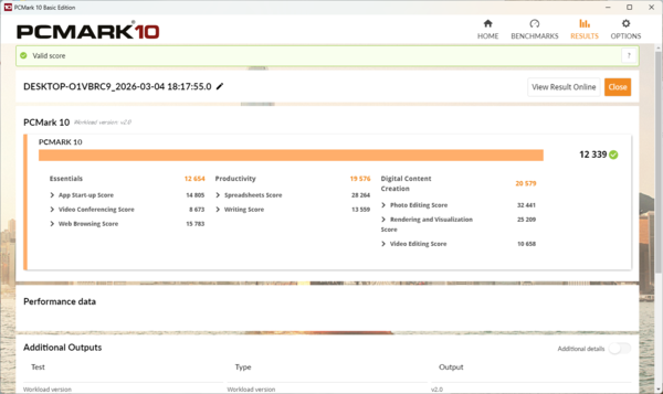 最後に、ゲーム以外のパフォーマンスもチェックしておこう。そこで、システム全体のパフォーマンスを推し量れる「PCMark 10」(Version 2.3.2912)で、無償版で利用できるPCMark 10“無印”のテストを実行してみた。