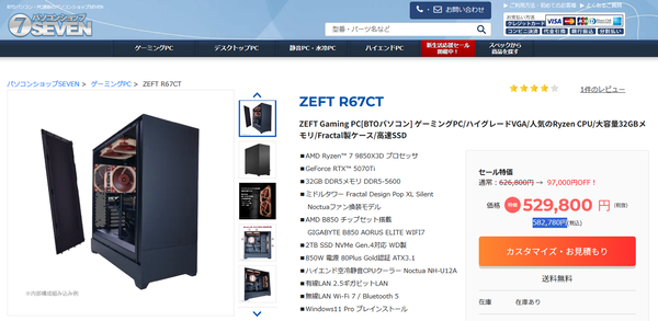 直販価格は標準構成で68万9480円と決して安価ではないものの、パソコンショップSEVENはとにかくセール特価が多い。記事執筆時点(2026年4月6日)の価格は58万2780円と10万円以上も安くなっていた。こういった機会を逃さずに狙ってほしい。