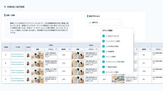 HookHackは、競合LPや広告表現のリサーチ、他社分析を起点とした複数パターンの訴求軸生成、広告運用における仮説検証を通じて、動画広告におけるインプットとアウトプットの関係を可視化し、売上差分創出につながる意思決定の再現性向上を支援します。