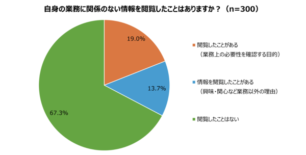 また、「自身の業務に関係のない情報を閲覧したことがあるか」という問いに対しては、32.7%が「ある」と回答した。その内訳を見ると、「業務上必要性の確認」が19%、「興味・関心」が13.7%であり、必ずしも悪意や意図的な不正ではなく、日常的な業務行動の延長として発生している実態が確認された。