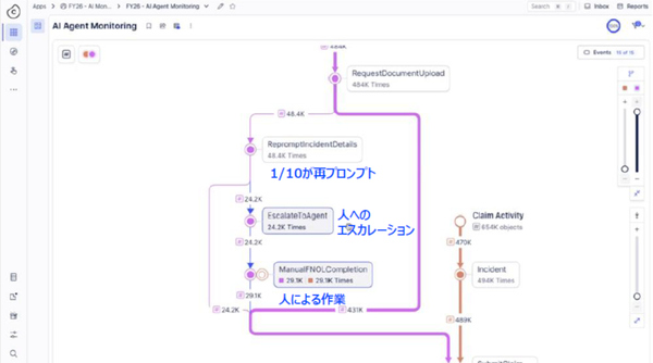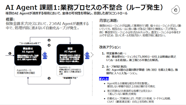 同社はこの問題をエージェントマイニングによって解決した。処理プロセスに潜在していたルールの不整合を発見し、受付エージェントに「5000ユーロ以上の場合は明細資料を必須とする」というルールを追加した。さらに、エージェント間でタスクの往復が3回を超えた場合は、自動的に人間にエスカレーションする設定にして、無限ループからの脱出を可能にした。