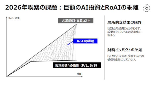 「AI投資は増えているが、多くがPoC(概念実証)のまま終わってしまったり、情報検索や文書要約といったタスク単位の効率化にとどまったりしている。企業のP/LやB/S(経営指標)を大きく改善するほどの価値を生めていない企業が多いのが実態だ」