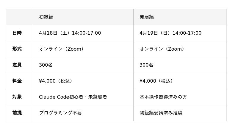 Claude Code 実践講座(初級編 4/18・発展編 4/19)