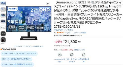 PHILIPSの液晶ディスプレイ「27E1N2600AE/11」がAmazonで割引対象。参考価格25,272円のところ、14%オフの21,800円で販売中。