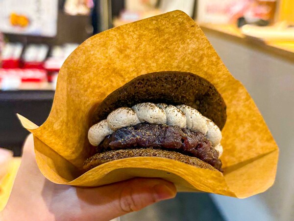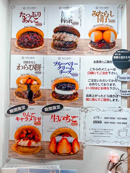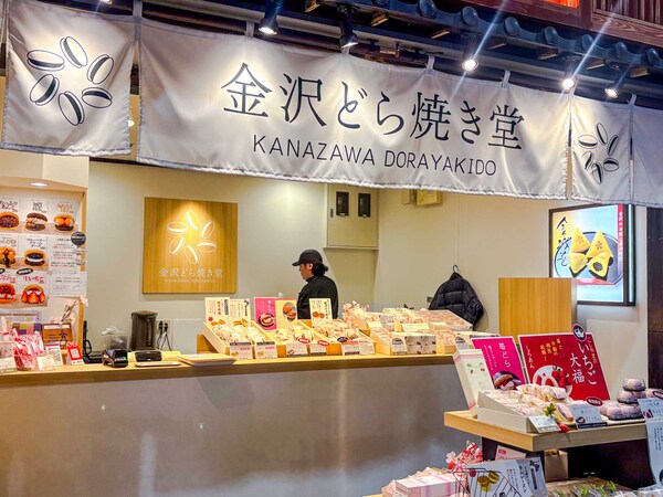 市場にはスイーツもあります。明治21年創業の和菓子屋「越山甘清堂」が手がけるどら焼き専門店「金沢どら焼き堂」を発見。発酵小豆や加賀棒茶のエキスが入った生地で、あんこやクリーム、フルーツを挟んだどら焼きが食べられます。