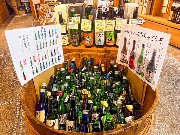市場には酒屋さんも1軒あります。お酒専門店「酒の大沢」では違いを教えてもらいながら、お土産用に300mlの日本酒を買いました。「何が違いますか」などと聞くと、お店の方がいろいろ説明してくれます。