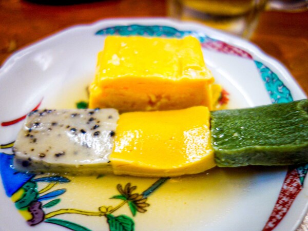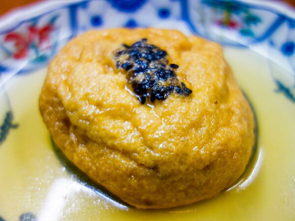 こちらでは「ひろず」と呼ばれる「がんもどき」も金沢おでんならでは。正式には「ひりゅうず」、漢字で書くと飛龍頭。関東のがんもどきは生地にニンジンやひじきが練り込んでありますが、金沢のがんもどきは龍に見立て、中にぎんなん(目玉)、ニンジン(心臓)、ごぼうと蓮根(骨)などが入ります。上にのった黒ゴマはひげ。