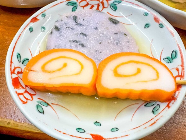 「金沢おでん」とは、普通のおでんと何が違うのでしょうか。菊一の女将・宮崎美恵子さんに聞きました。金沢おでんは地元の食材を使っていることが特徴で、車麩、梅貝、赤巻き(なると)が具材にあることが特徴だそうです。冬は香箱蟹を使った「カニ面」があるとのこと。次回は絶対に香箱蟹に時期に行くんだ……。