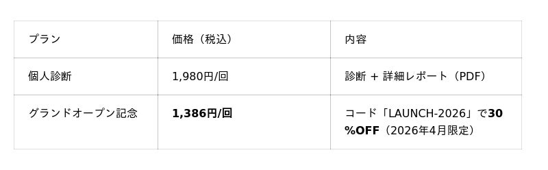 診断の回答は無料です。結果の概要を確認した上で、詳しく知りたい方のみ詳細レポート(¥1,980)をご購入ください。