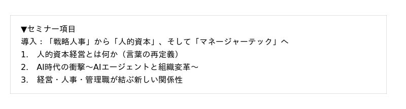 本セミナーは、トイトイ合同会社 代表 永島 寛之 氏をゲストに迎え、「AI時代における人的資本経営~経営・人事・管理職が結ぶ新しい関係性~」をテーマに開催しました。人的資本経営の重要性が高まる一方で、実践に悩む企業も多い中、経営と現場の視点からその本質を紐解き、3者(経営・人事・管理職)の連携のあり方を探りました。さらに、海外の最新動向も交えながら、AIを単なる効率化ではなく、人や組織の能力を拡張し、付加価値を生む存在としてどう活用すべきかについて解説しました。