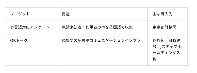 「東京都庁に当社の多言語技術を採用いただき、その有効性が公式に認められたことを大変光栄に思います。当社が取り組んでいるのは、単なる翻訳ではなく、母国語のまま伝わる"言語インフラ"の構築です。この技術は都庁のアンケートだけでなく、建設現場の安全管理を担う『QRトーク』にも展開しています。行政で実証された技術が、産業現場の事故予防や業務効率化にも貢献できる。言語の壁をインフラで解消するという当社のビジョンを、今後もあらゆる現場で実現してまいります。」