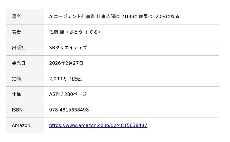 『AIエージェント仕事術 仕事時間は1/100に 成果は120%になる』(SBクリエイティブ)