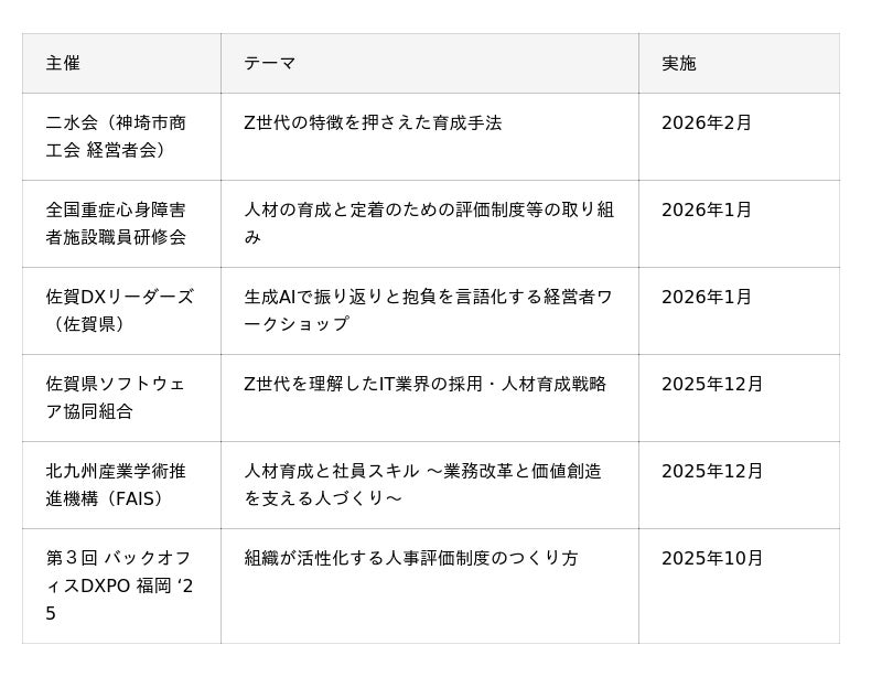 Z世代の育成・評価制度設計といった人事テーマと、生成AI活用・DX推進を横断して講演できる講師は希少です。「人のマネジメントとテクノロジー活用を一緒に考えたい」という主催者ニーズに応えます。