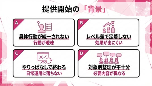 - 対象者(新入社員、若手、中堅、管理職、現場職)ごとに必要な内容が異なるのに整理されない