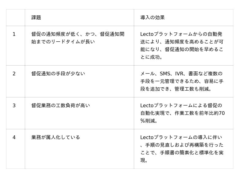 サービス利用者の増加に伴い、債権管理や督促・回収の業務の負荷も増加しており、顧客の支払い体験向上を図るベく、通知手段が多様で債権管理や督促回収業務プロセス全体をワンストップで自動化・効率化できる「Lectoプラットフォーム」を導入いただきました。また、導入後は、業務の自動化などにより前年比で70%工数削減に成功しています。