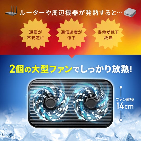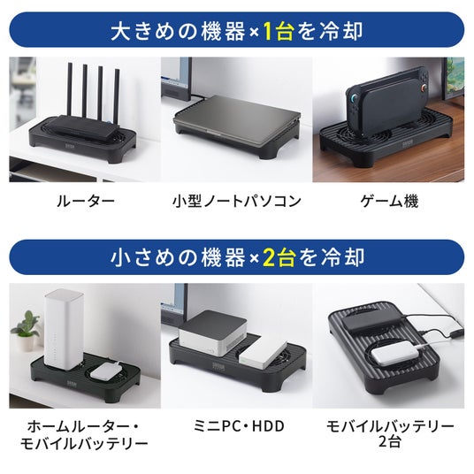 ルーター・ネットワーク機器や、各種周辺機器の熱を効率よく逃がし、安定稼働をサポートする小型クーラーです。