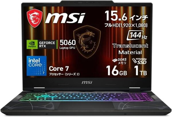 Cyborg 15 B2RWは、インテル「Core 7 240H」とNVIDIA「GeForce RTX 5060」を搭載する15.6型ゲーミングノートPC。メモリーは16GB(DDR5)、ストレージは1TB M.2 SSD、OSはWindows 11 Home、リフレッシュレートは144Hzなどとなっている。そのほか、CPU・GPUの熱を効率よく排出してくれる内蔵クーラーやRGBバックライト内蔵のキーボード、「Wi-Fi 6E」の無線LANなども特徴だ。