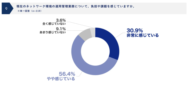 ネットワーク運用を「負担」と感じている担当者はおよそ9割(87.3%)。ほとんど全員と言ってもよく、例外の方が少ないレベルです。