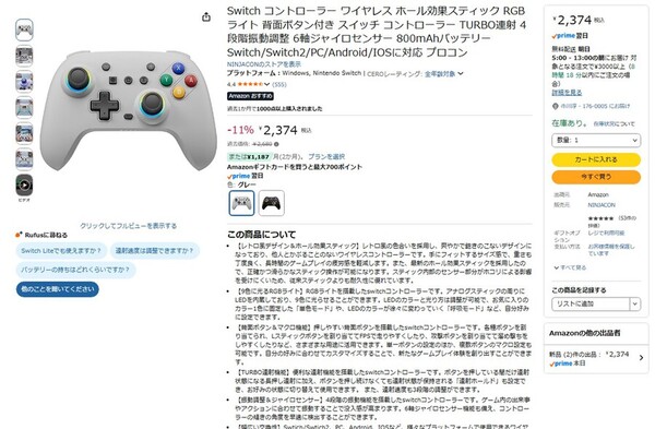 Amazon.co.jpにて、Nintendo Switch 2に対応する「レトロ風無線コントローラー」が販売中だ。過去価格は2680円だが、執筆時点では11%オフの2374円で購入できる。