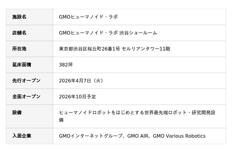 「すべての人にインターネット」をコーポレートキャッチに掲げるGMOインターネットグループ(代表取締役グループ代表:熊谷正寿)は、2026年4月7日(火)、「GMOヒューマノイド・ラボ」を始動し、東京・渋谷のグループ本社「セルリアンタワー」11階に、日本初かつ日本最大級(※1)のフィジカルAI研究開発拠点「GMOヒューマノイド・ラボ 渋谷ショールーム」を開設しました。延床面積382坪のうち約2分の1を先行オープンし、2026年10月には全面開業を予定しています。(Webサイト:https://humanoid-lab.gmo )