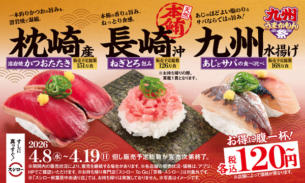 120円台から本鮪やかつおなどのネタが楽しめる「九州うまかもん祭」が4月8日よりスタートします。すしだけでなくラーメンや唐揚げ、スイーツまでそろっているので、食事全体で九州の味をまとめて楽しめそうです。