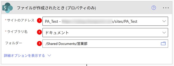今回のフローのトリガーには、「SharePoint」コネクタの「ファイルが作成されたとき(プロパティのみ)」トリガーを利用します。あらかじめ指定したSharePointリストに新規ファイルが追加(作成)されたときに起動するトリガーです。