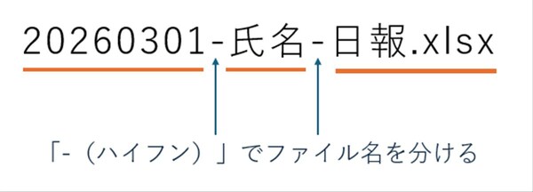 たとえば上図のようなファイル名であれば、「20260301」「氏名」「日報.xlsx」という3つの文字列に分割されるわけです。