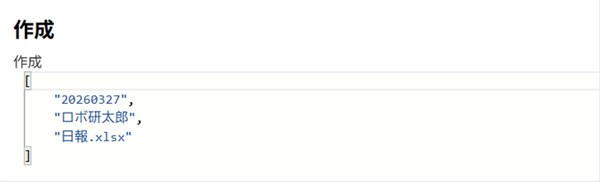 ファイル名の「yyyyMMdd」の部分には「20260405」のような8桁の作成年月日、「氏名」にはファイル作成者の名前を入力してもらう想定です。また、最後の「日報.xlsx」の部分は固定で、全員が必ず入力します。