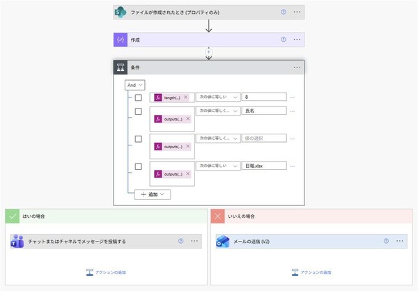 このフローは、「1. 事前準備」で作成したフォルダーにファイルが保存されたら自動的に起動します。ファイル名をチェックし、命名規則に合っていればTeamsに通知、不備があればアップロードした本人に注意喚起のメールを送信する、シンプルなフローです。