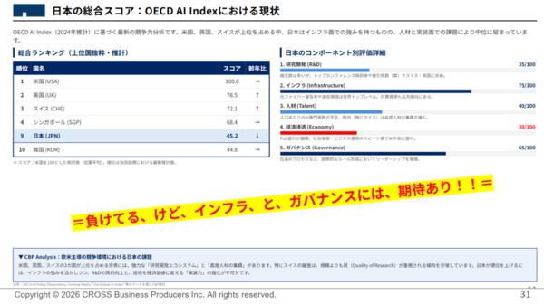 続いて、代表取締役の三木言葉氏は、国際機関OECDのAIインデックスが2026年2月19日に発表した日本の国際競争力評価を紹介した。AIの総合ランキングでは、日本はトップ層に入っておらず、三木氏は「偏差値40レベル」と表現する。
