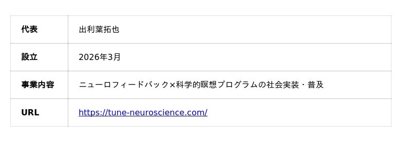 株式会社 FastNeura (本社:東京都文京区、代表取締役 CEO:水口成寛、以下「FastNeura」)と、ニューロフィードバックの社会実装を推進する TUNE プロジェクト(代表:出利葉拓也、以下「TUNE」)は、ニューロフィードバック技術の高度化および脳状態最適化に関する共同研究契約(MOU:Memorandum of Understanding)を締結いたしましたことをお知らせいたします。