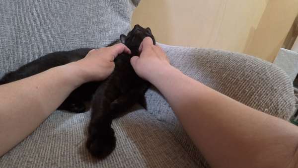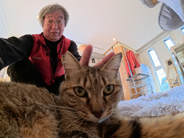 超広角なので腕がすごく長く見える。顔が写るように撮りたかったのだが、気持ちよくて顎をもっと撫でろと上を向かれてしまったのだった。2026年4月 insta360 GO Ultra