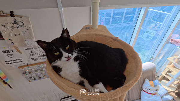 そこにいたのは貫禄あるハチワレなのだった。ベロを出した瞬間をキャプチャ。「残念でしたー」とは言ってないと思うけど。2026年3月 insta360 GO Ultra