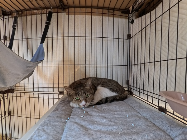 いつもハンモックで寝てた「わさび」はといえば、体調不良でケージに隔離されており、それをいいことに違う猫が入っていたのだ。