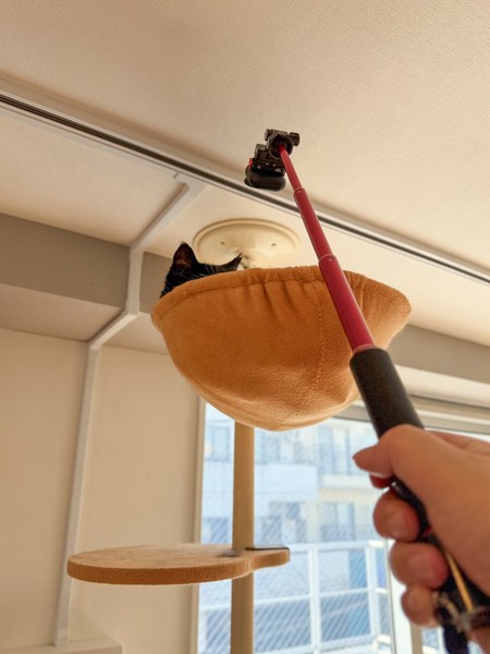 手が届かない高いところにいる猫も撮れるってんで、保護猫シェルターqueueで天井スレスレにある猫ハンモックを覗いてみた。これをやりたかったのだ。