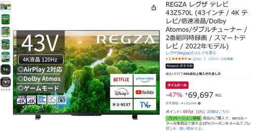 REGZAの液晶テレビ「REGZA 43Z570L」がAmazonタイムセール対象。参考価格132,000円のところ、47%オフの69,697円で販売中。