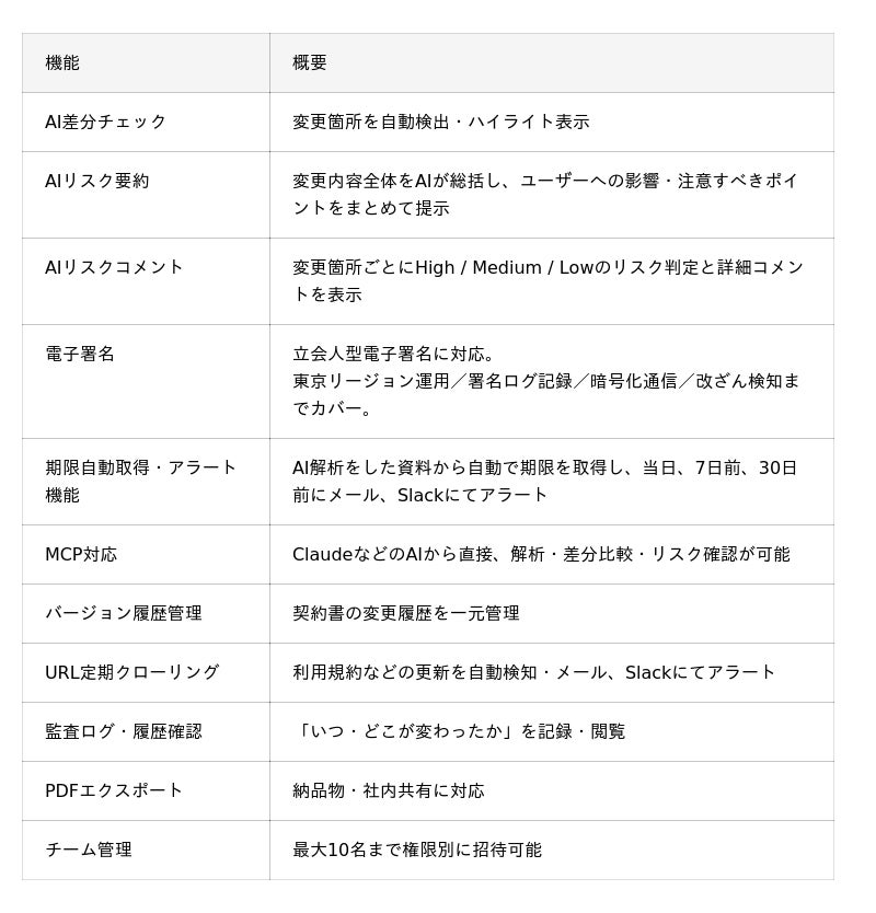契約書の差分チェック・リスク判定・期限管理・電子署名まで一体で提供します。