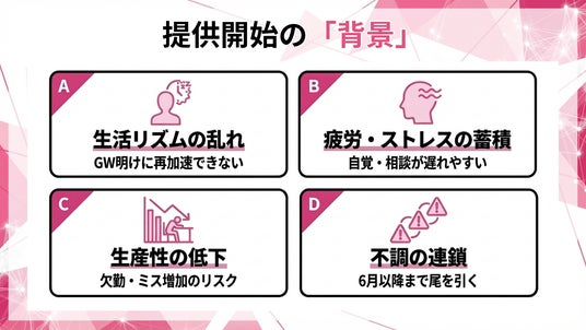 【5月病対策を実装】GW明けの立ち上がり遅れと早期離職リスクに先回りする生活習慣化プログラムの提供開始