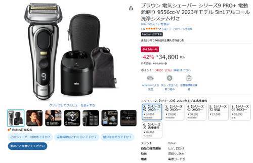 ブラウンの電気シェーバー「シリーズ9 PRO+(9556cc-V)」がAmazonタイムセール対象。参考価格59,800円のところ、42%オフの34,800円で販売中。