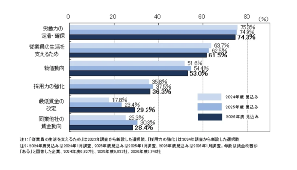 賃上げの「理由」についてたずねると、「社員に長くいてもらうため」という回答が首位となったのだ。「儲かっているから上げる」というよりも、「辞められると困るから上げる」という“防衛的な賃上げ”の傾向が見えてくる。