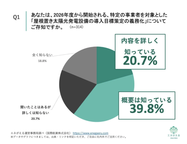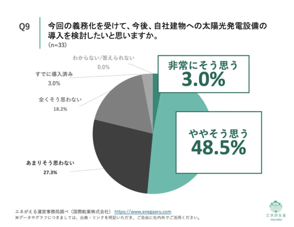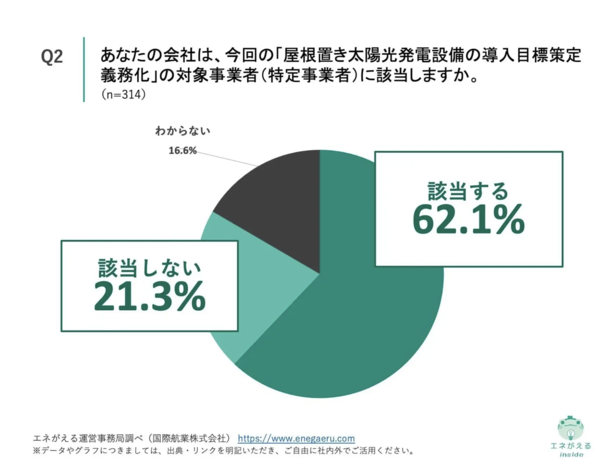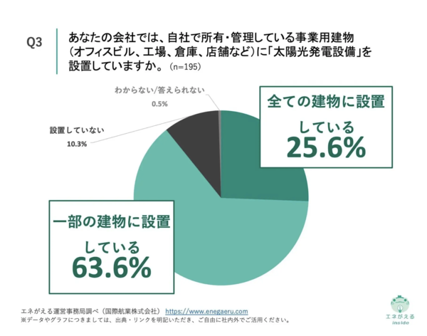 また、自社が義務化対象に該当すると回答した企業は62.1%にのぼり、そのうち89.2%がすでに太陽光発電設備を導入済みと回答。ただし「全ての建物に設置している」との回答は25.6%にとどまり、多くは一部導入にとどまっている状況だという。