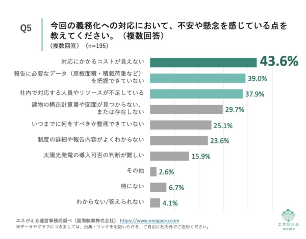 義務化に向けた準備としては、「屋根面積の把握・整理」(52.3%)や「制度の詳細情報の収集」(48.7%)などが上位に挙がった。一方で、不安や課題としては「対応コストが見えない」(43.6%)が最多で、「報告に必要なデータを把握できていない」(39.0%)、「人員・リソース不足」(37.9%)など、実務面での課題が多かった。