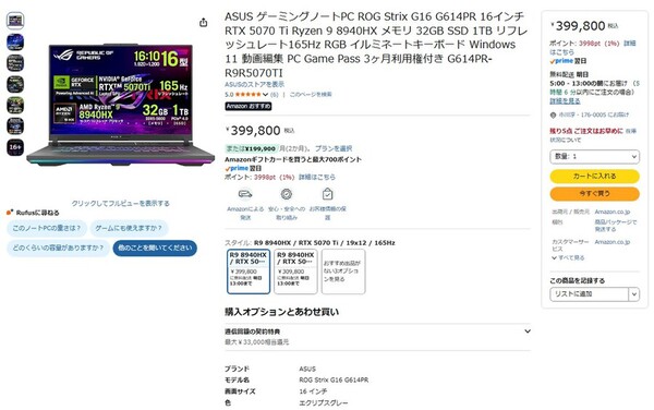 Amazon.co.jpにて、ASUSの16型ゲーミングノートPC「ROG Strix G16 G614PR」が販売中だ。価格は39万9800円。