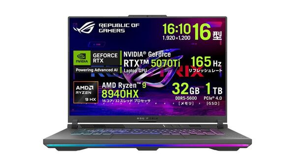 ROG Strix G16 G614PRは、AMD「Ryzen 9 8940HX」とNVIDIA「GeForce RTX 5070 Ti」を搭載するゲーミングノートPC。メモリーは32GB(DDR5-5600)、ストレージは1TB M.2 SSD、リフレッシュレートは165Hz、解像度は1920×1200ドット(16:10)、OSはWindows 11 Homeなど。