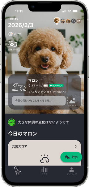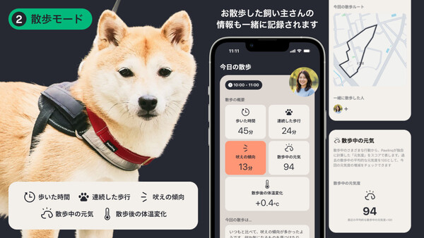 2つ目は、散歩の可視化だ。スマートフォンと連携し、歩いたルートや歩行状態、体温の変化などを記録する。今日はいつもよりゆっくりだったか、息が上がっていなかったか。散歩後のレポートで「いつもと同じ」を確認できること自体が、安心につながる。