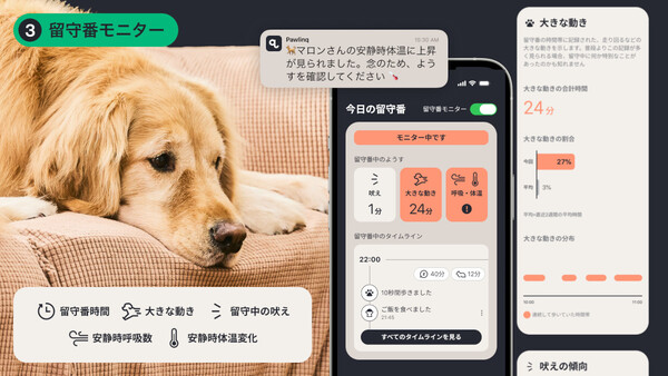 3つ目は、留守番の状態把握だ。犬は猫よりも留守番が苦手なケースが多いと言われる。吠え続けていないか、不安で落ち着かず動き回っていないか。留守番の質を数値で可視化することで、飼い主の不安は和らぐ。