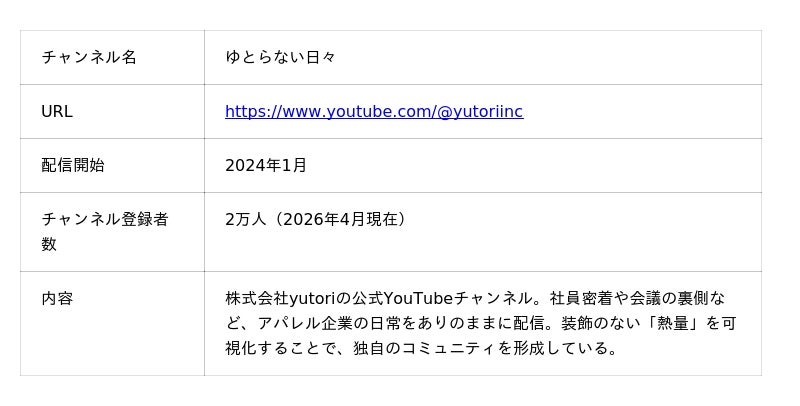 アパレルブランドを多数展開し、2023年末に東証グロース市場への上場を果たした株式会社yutori。同社は上場のタイミングで公式YouTube「ゆとらない日々」をスタートさせ、瞬く間に若年層やビジネス層からの圧倒的な支持を獲得しました。さらに、代表である片石貴展氏の個人チャンネル「ゆとりくんチャンネル」も開設し、わずか1年でチャンネル登録者数約6.5万人を突破するなど、破竹の勢いでYouTubeをハックしています。