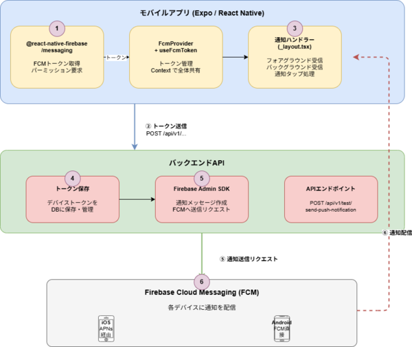 この記事ではモバイルアプリ側(1〜3)にフォーカスします。 バックエンド側は「FCMトークンを受け取って Firebase Admin SDK で送る」というシンプルな構成なので、詳細は割愛します。