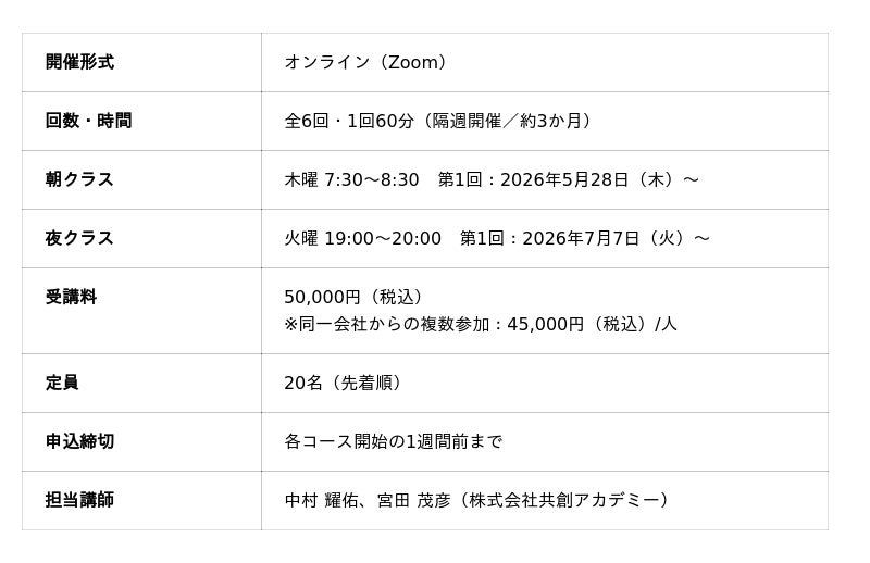 「あり方×スキル×関係性」を核とした組織開発・人材育成の専門企業である、株式会社共創アカデミーは、2026年5月28日より、会議をよりよく改善する実践プログラム「会議ドック」の提供を開始します。「なんとなく終わる会議」「進行が苦手でつらい」-そんな現場の声に応える、全6回・隔週オンライン形式の実践プログラムです。それに伴って、まずは30分のオンライン説明会(4月21日・5月12日)を開催いたします。