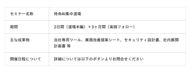 - 2日間で「動くツール」をその場で即実装 「学んで終わり」にせず、参加企業の個別の業務課題に合わせた実用的なツールを2日間で構築します。あわせて、セキュリティ設計書や社内展開計画書などの成果物4点(自社専用ツール/業務改善提案シート/セキュリティ設計書/社内展開計画書)を持ち帰ることで、翌日から即運用が可能です 。